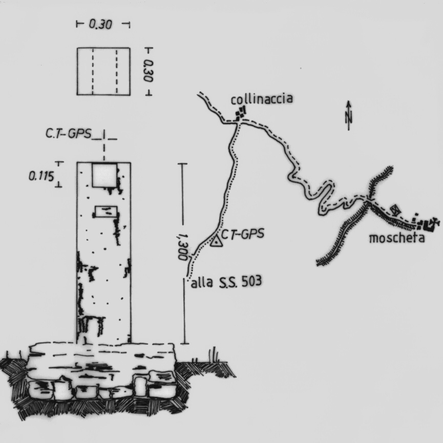 | Materializzazione | Piastra metallica con foro centrale cementata alla sommità di un pilastrino a sezione quadrata. |