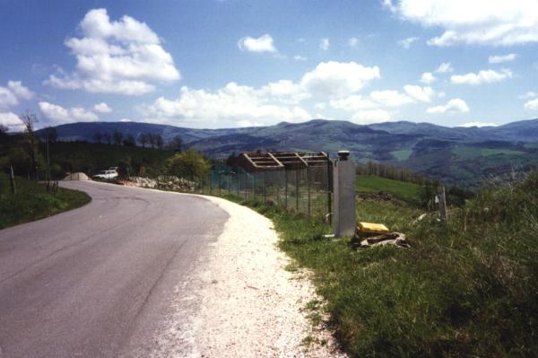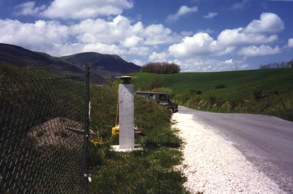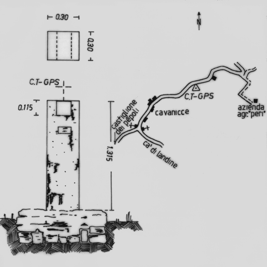 Piastra metallica con foro centrale cementata alla sommità di un pilastrino a sezione quadrata.