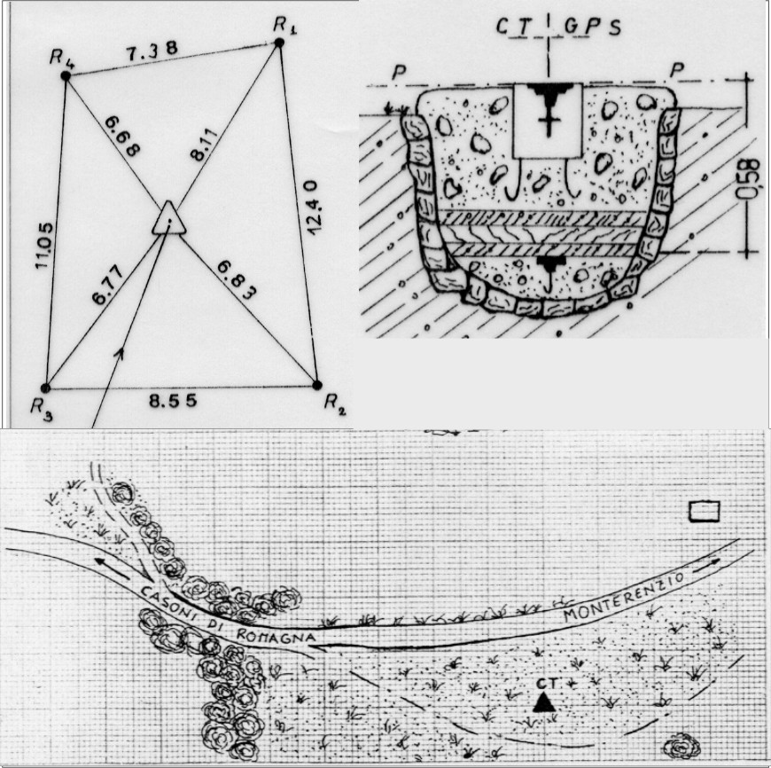 | Materializzazione | Centrino del tipo "GPS A" fissato su preesistente centrino IGM in blocchetto di calcestruzzo prefabbricato con sottostante centrino di fondo coassiale, posto su di un rilievo a sud della casa Il Gufo. |