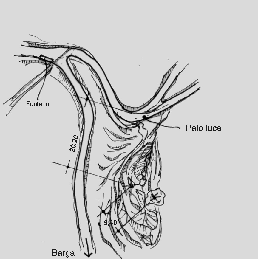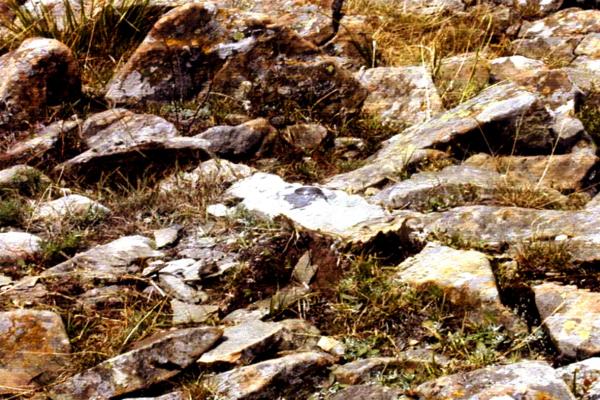 Centrino in accaio inox, uguale a quello del tipo "GPS C" ma senza scritte, con affiancata targhetta blu recante le caratteristiche tecniche del punto, infisso in roccia affiorante.