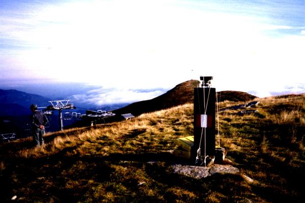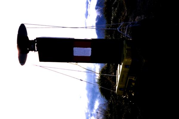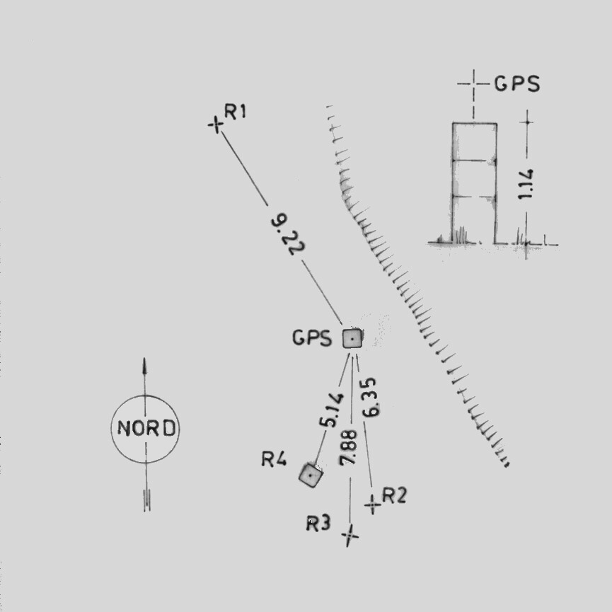 Asse geometrico del presistente pilastrino in ferro a sezione triangolare. Riferimenti: R1 (centrino su roccia): 327° – 9,22 m; R2 (croce incisa su roccia): 172° – 6,35 m; R3 (centrino su roccia): 180° – 7,88 m; R4 (centro "rosa dei venti"): 196° – 5,14 m.
