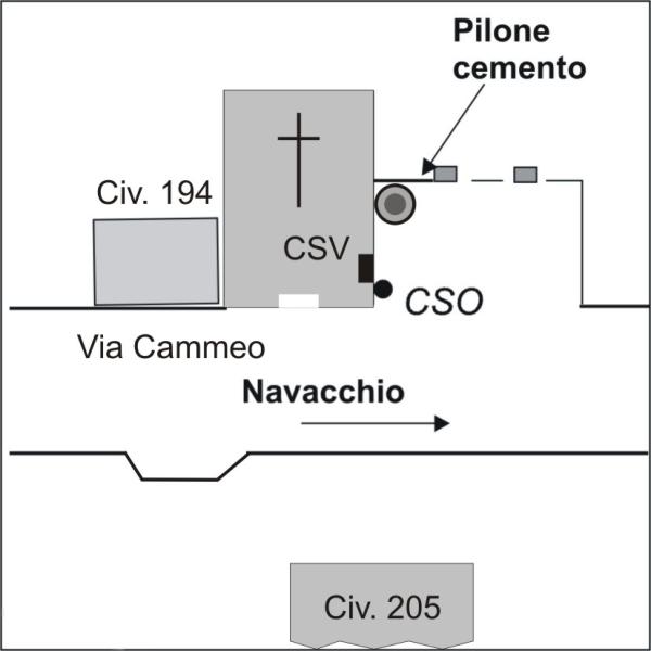 | Contrassegni | [{"simbolo_contrassegno":"B1","materializzazione":"(CSO) – Bullone infisso nella parete laterale destra, spigolo sinistro."},{"simbolo_contrassegno":"V1","materializzazione":"(CSV) – Mensola infissa in corrispondenza del cso ."}] |