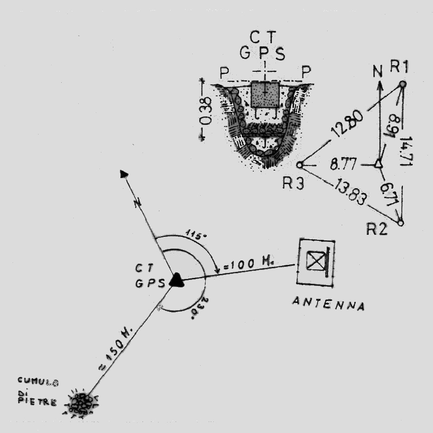 | Materializzazione | Centrino del tipo "GPS A" fissato su centrino di superficie IGM cementato in blocchetto di calcestruzzo prefabbricato, con sottostante centrino di fondo coassiale, posto a nord-est della sommità del Monte Fogola. |