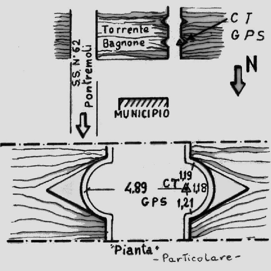 Centrino del tipo "GPS C" fissato sul pavimento, lato ovest, in corrispondenza del pilone nord-ovest del ponte pedonale sul Torrente Bagnone.