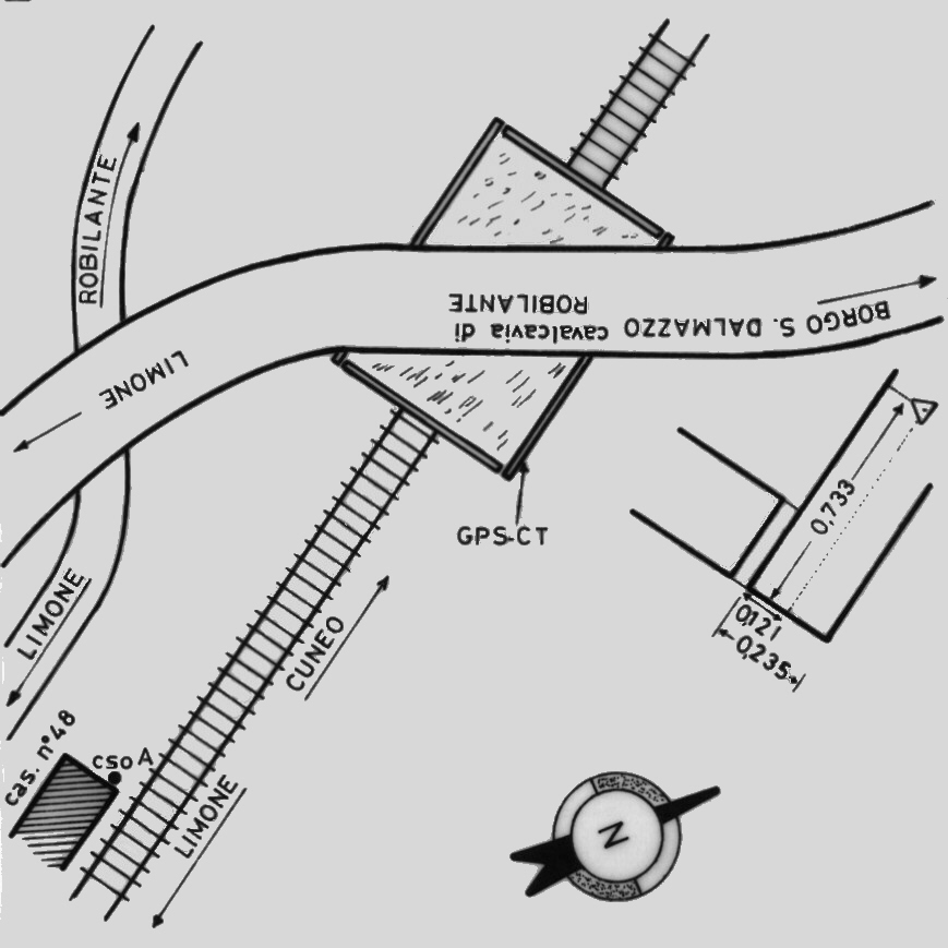 | Materializzazione | Centrino del tipo "GPS C" infisso presso lo spigolo sud-est del parapetto in cemento armato del cavalcavia della S.S.20 sulla linea ferroviaria Cuneo-Limone Piemonte, ad ovest dell'abitato di Robilante. |