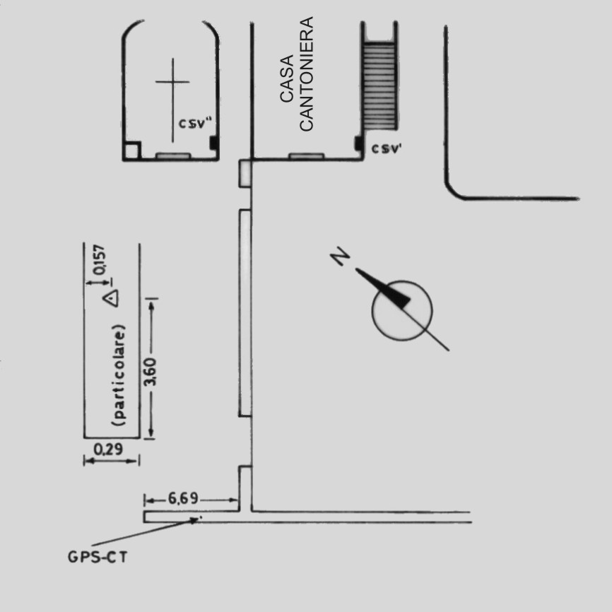 | Materializzazione | Centrino del tipo "GPS C" infisso sul muretto a prosecuzione del muro di cinta della casa cantoniera sita al km 99,700, lungo il lato sud della S.S. 20. |