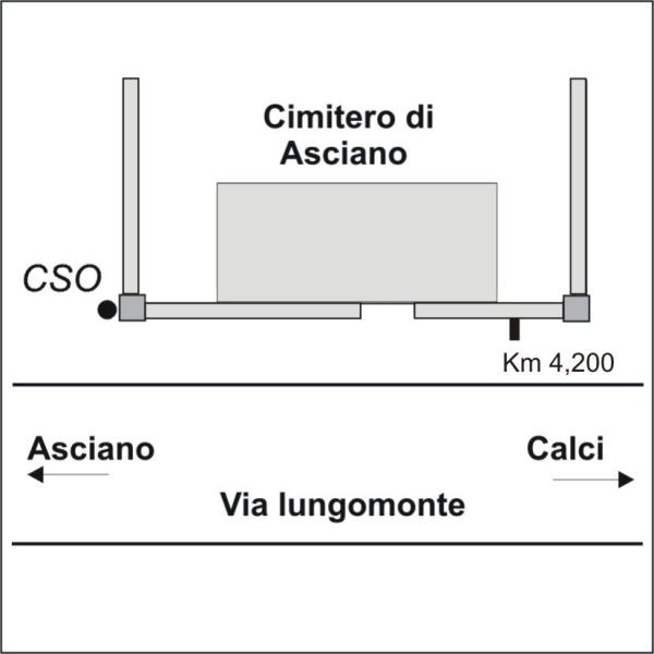 [{"simbolo_contrassegno":"B1","materializzazione":"(CSO) – Bullone infisso alla base dello spigolo del muro di recinzione del cimitero di Asciano,lato verso Asciano."}]