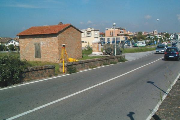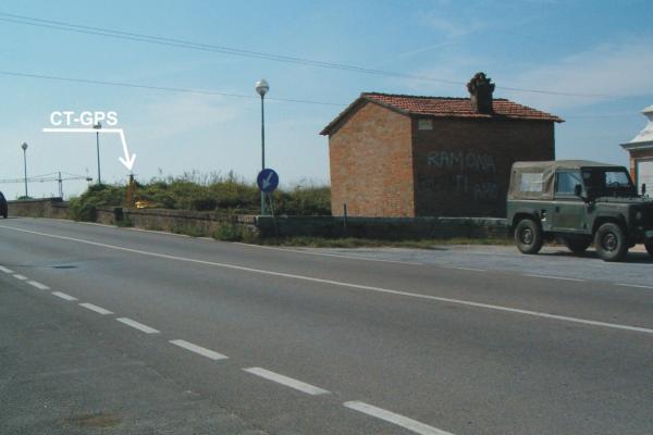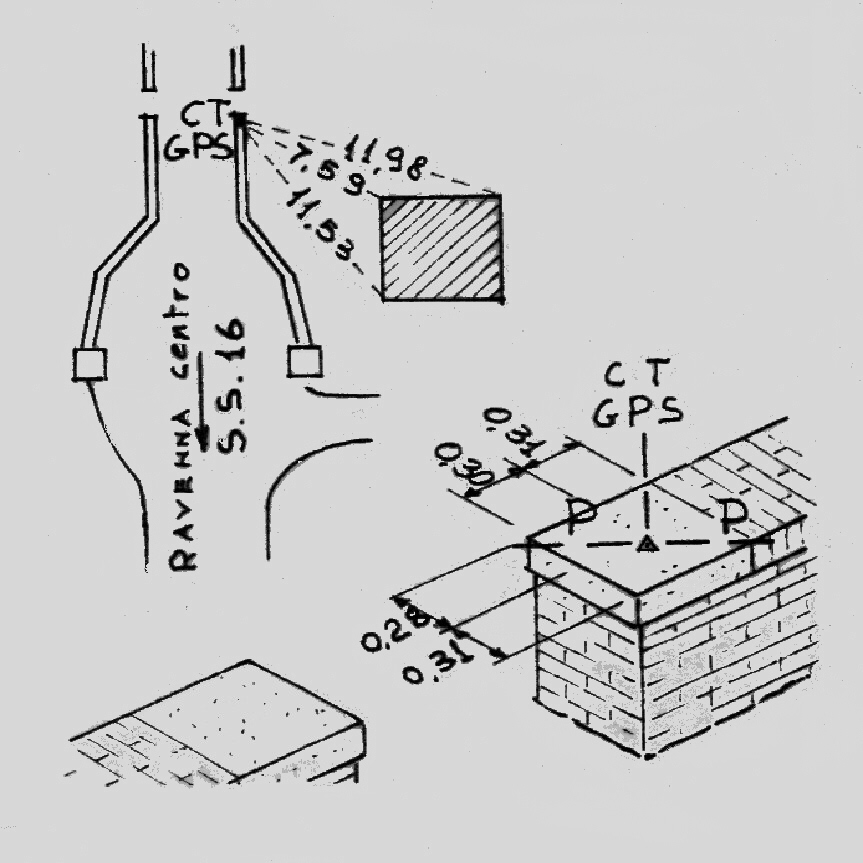Centrino del tipo "GPS C" fissato alla sommità del parapetto in cemento e mattoni della spalletta sinistra a monte, in prossimità dell'imbocco del ponte omonimo e in corrispondenza del passaggio pedonale (SS.16 Ravenna Sud).