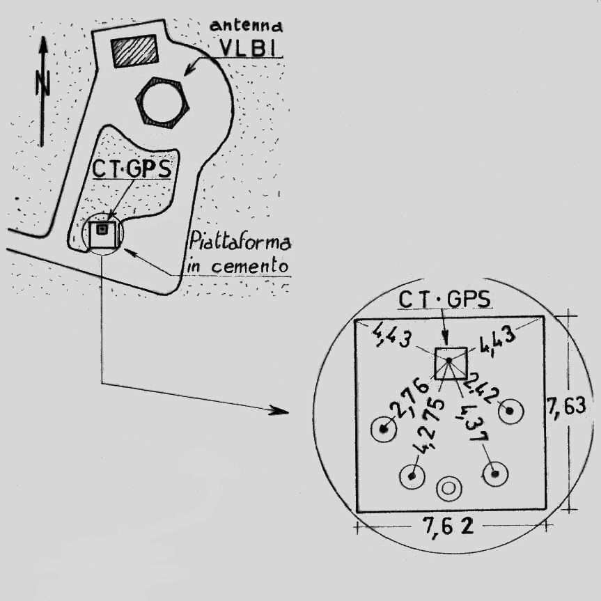 | Materializzazione | Bulloncino in acciaio del CNR posto più a nord rispetto agli altri 4 presenti su una piattaforma in cemento a sud-ovest dell'antenna VLBI del radiotelescopio "Croce del Nord" del CNR di Medicina. Sono stati misurati anche i 4 riferimenti del CT-GPS |