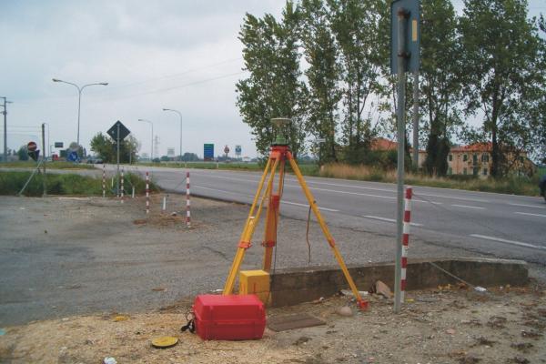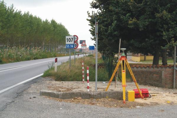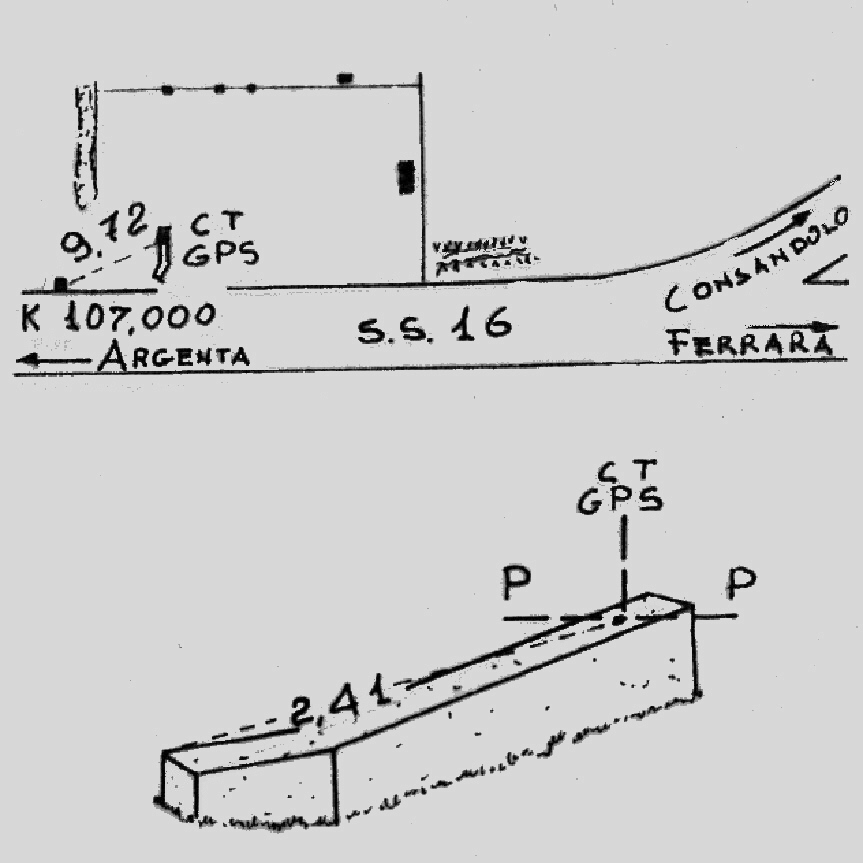 Centrino del tipo "GPS C" fissato alla sommità della spalletta sinistra in cemento dell'accesso alla cabina di riduzione della pressione del gas metano. In corrispondenza del Km 107 della SS. n.16.