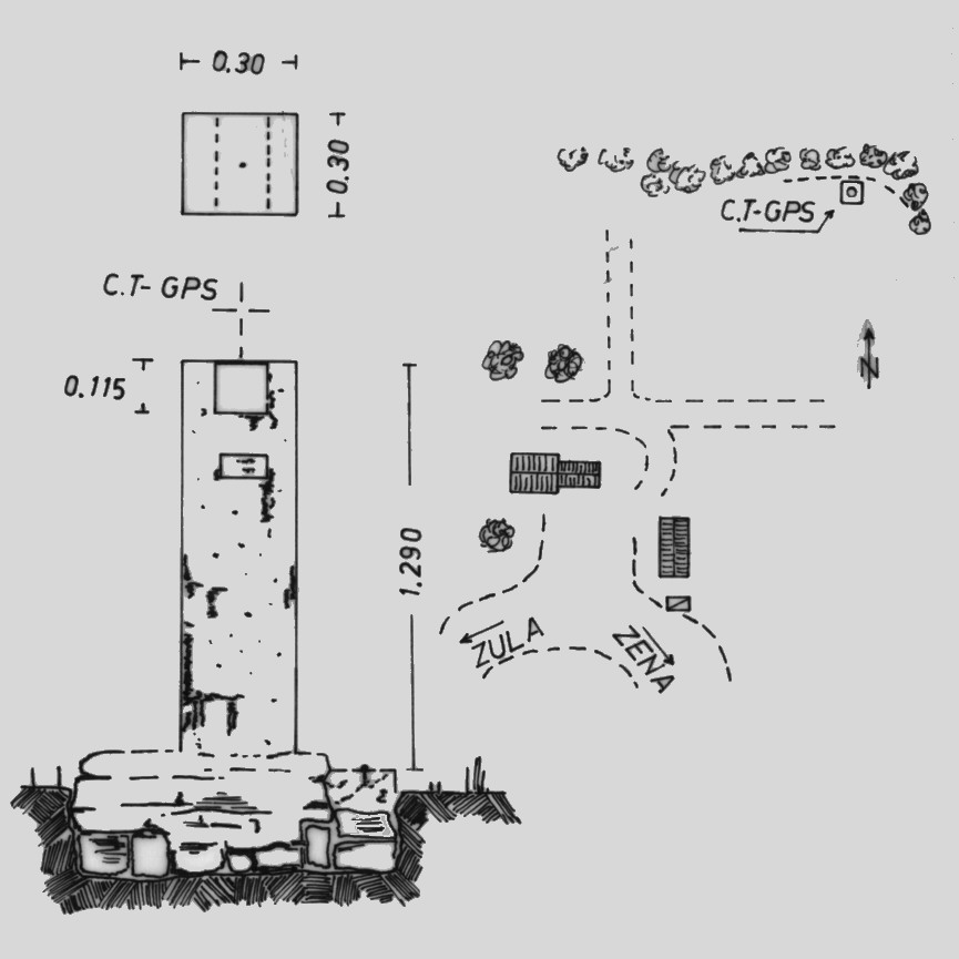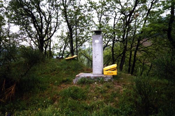 Piastra metallica con foro centrale cementata alla sommità di un pilastrino a sezione quadrata.