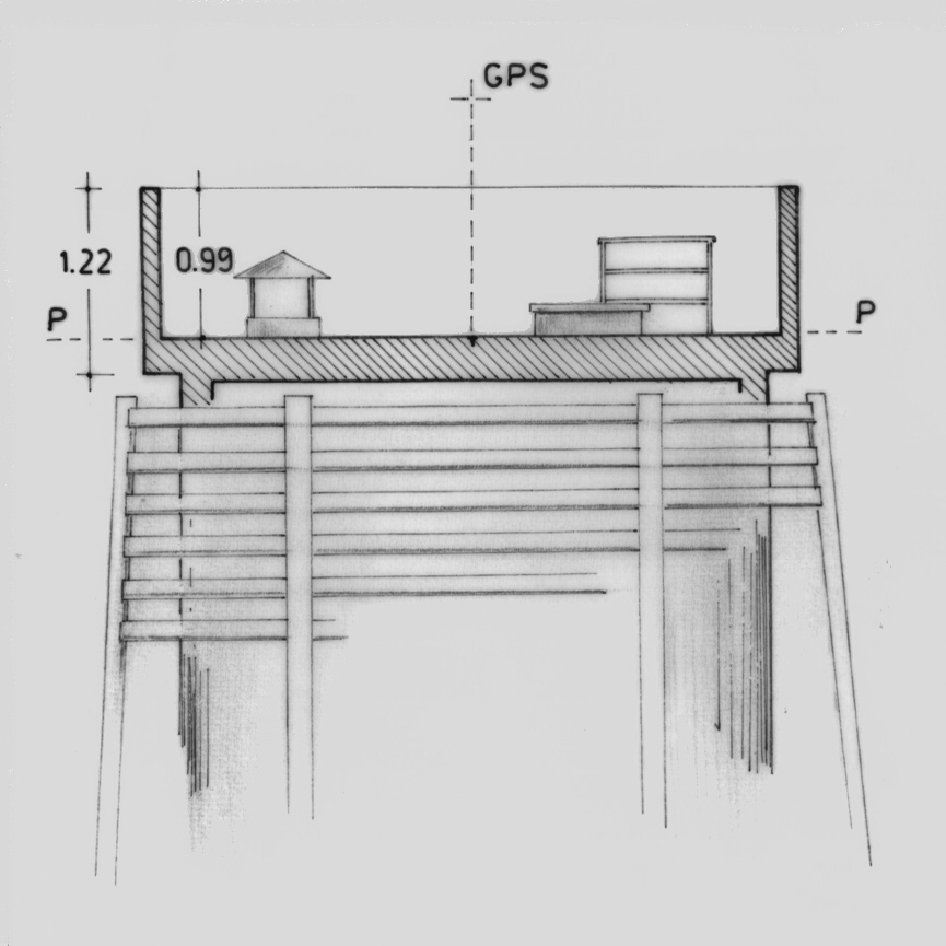 | Materializzazione | Centrino del tipo "GPS C", fissato in corrispondenza del centro geometrico del pavimento della terrazza a copertura del serbatoio pensile in cemento armato, coincidente con l'asse del manufatto. |