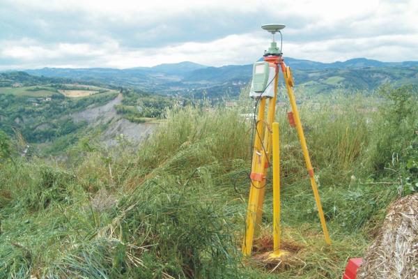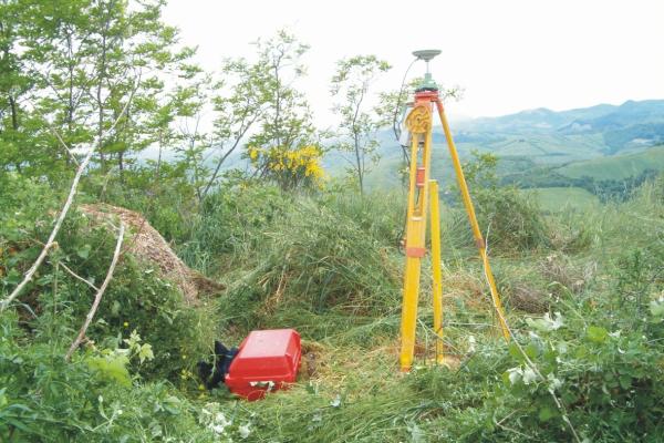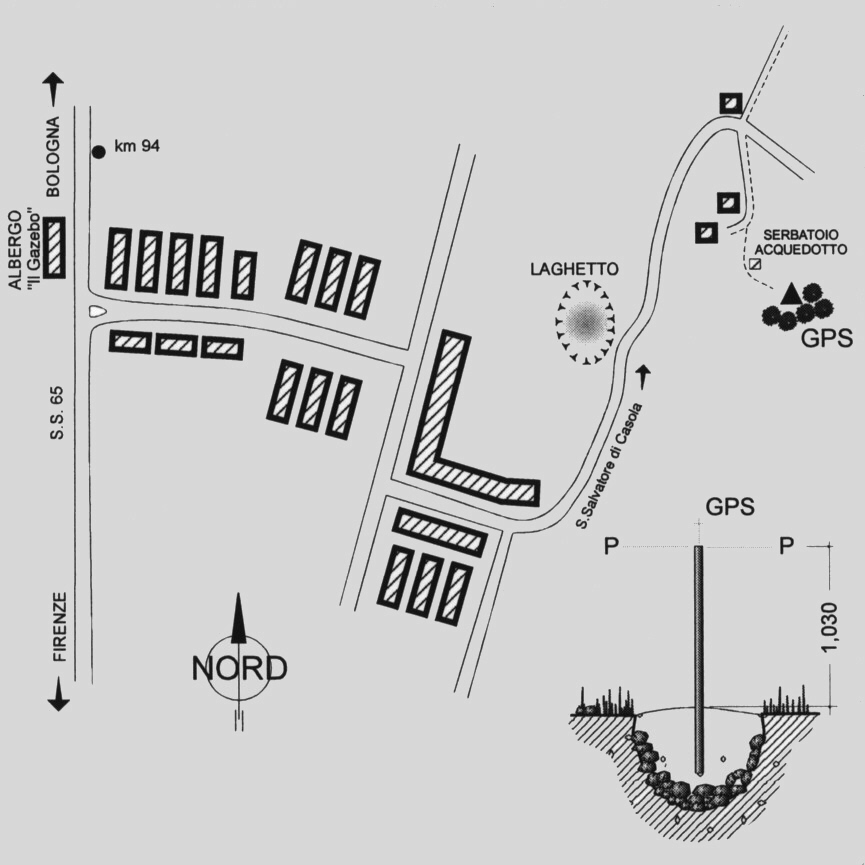 Centrino del tipo "GPS A" fissato alla sommità di un tubo metallico (diametro 4,5 cm) cementato in un blocco di calcestruzzo di cm 50×50 circa.