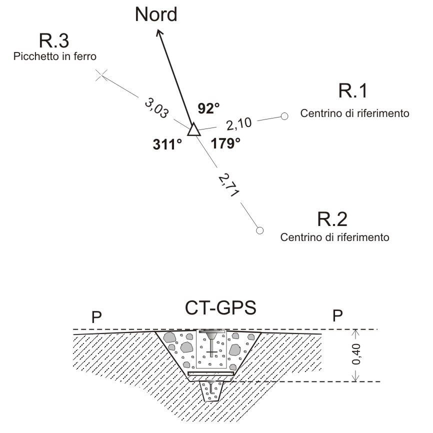 | materializzazione | Centrino del tipo "GPS A" fissato su centrino IGM di un blocchetto prefabbricato, con sottostante centrino di fondo coassiale, posto alla sommità del monte omonimo. |