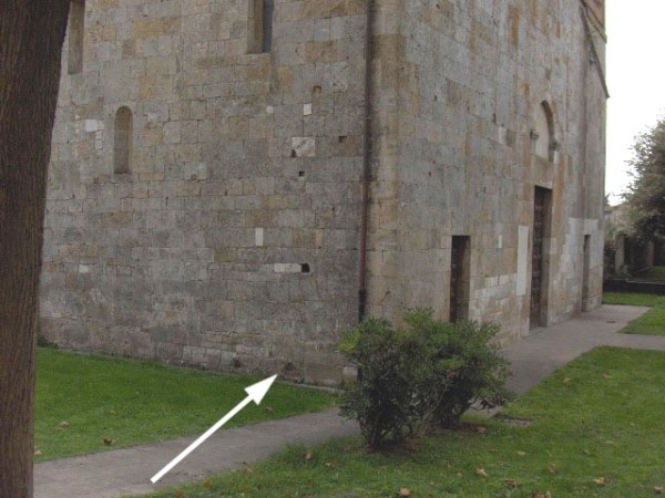 [{"simbolo_contrassegno":"B1","materializzazione":"(CSO) – Bullone infisso alla base della facciata sinistra,spigolo anteriore ."}]