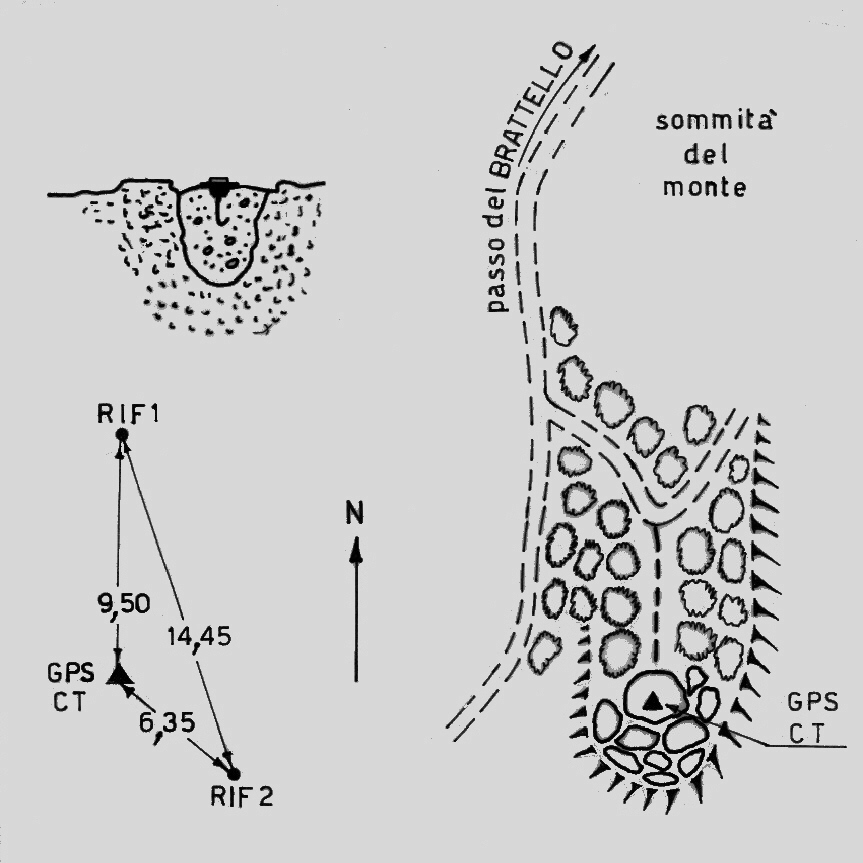 | materializzazione | Centrino di tipo "GPS A" fissato su un centrino di fondo cementato sulla cima dello sperone di roccia sito a circa 400 m a sud della cima del monte. |
