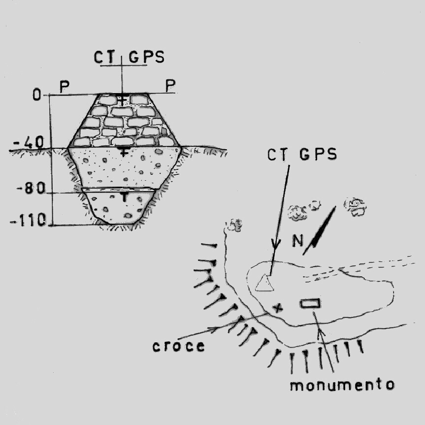 Centrino del tipo "GPS A" fissato sul centrino di superficie coassiale ai centrini di fondo e cementato in un basamento tronco-piramidale in calcestruzzo, ubicato alla sommità del monte omonimo.
