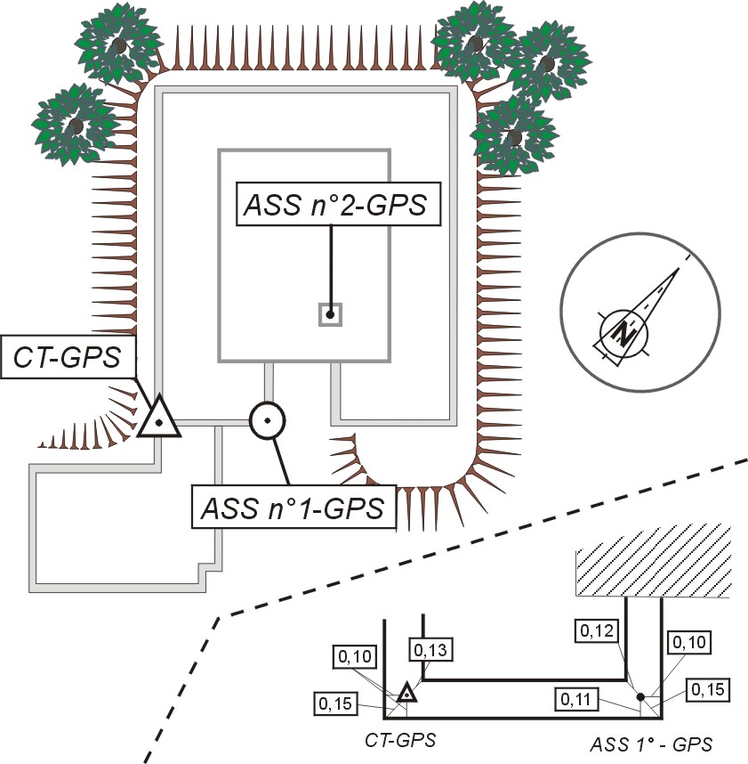 | materializzazione | Centrino di tipo "GPS C" infisso sullo spigolo sud del muro in cemento armato più esterno del serbatoio dell'acquedotto. |