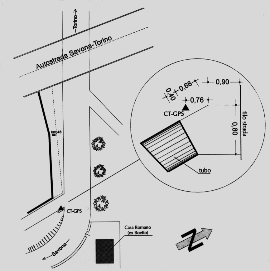 | materializzazione | Centrino in acciaio inox del tipo "GPS C" infisso alla sommità del muretto in calcestruzzo del pozzetto esistente sul lato destro, in direzione di Ceva, della S.S.28 al km 48,100 circa, in località Casseneto. |