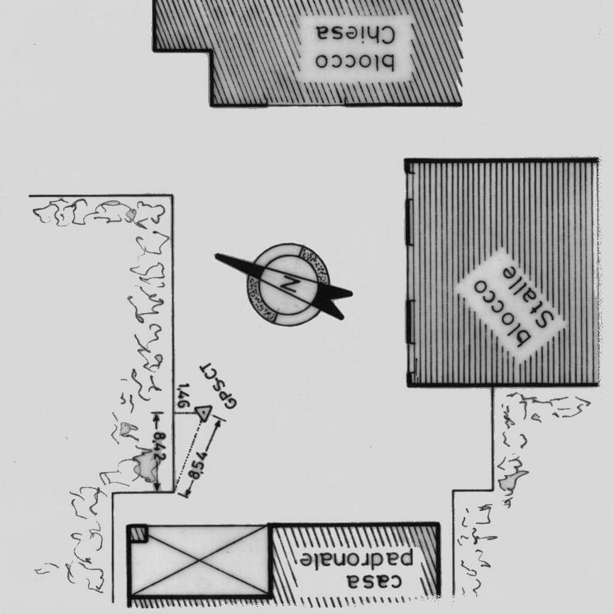| materializzazione | Centrino del tipo "GPS C" infisso nella pavimentazione in cemento del piazzale antistante la casa padronale, lato giardino. |