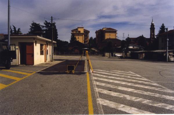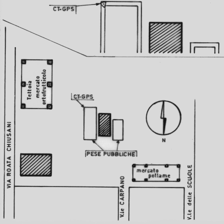 | materializzazione | Centrino in acciaio inox del tipo "GPS C" infisso nello spigolo sud-est della pesa pubblica, di fronte alla tettoia del mercato ortofrutticolo, ubicata in Piazza Don Stefano Gerbaudo. |