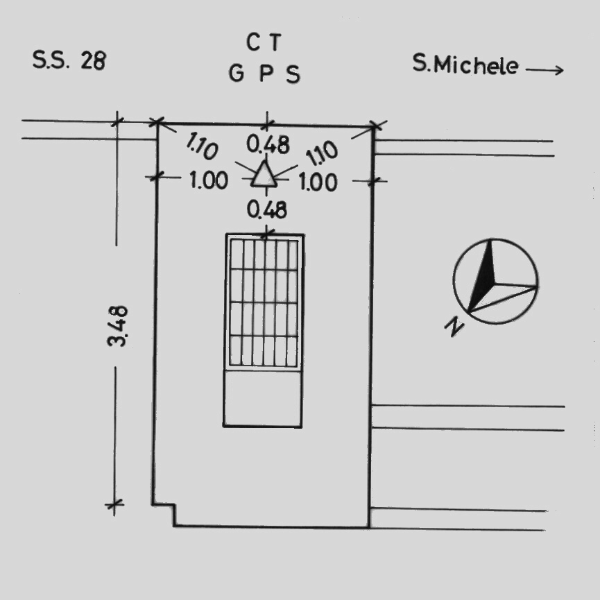 | materializzazione | Centrino del tipo "GPS C" infisso su blocco di granito cementato sopra una chiavica in cemento armato, a margine della S.S. 28. |