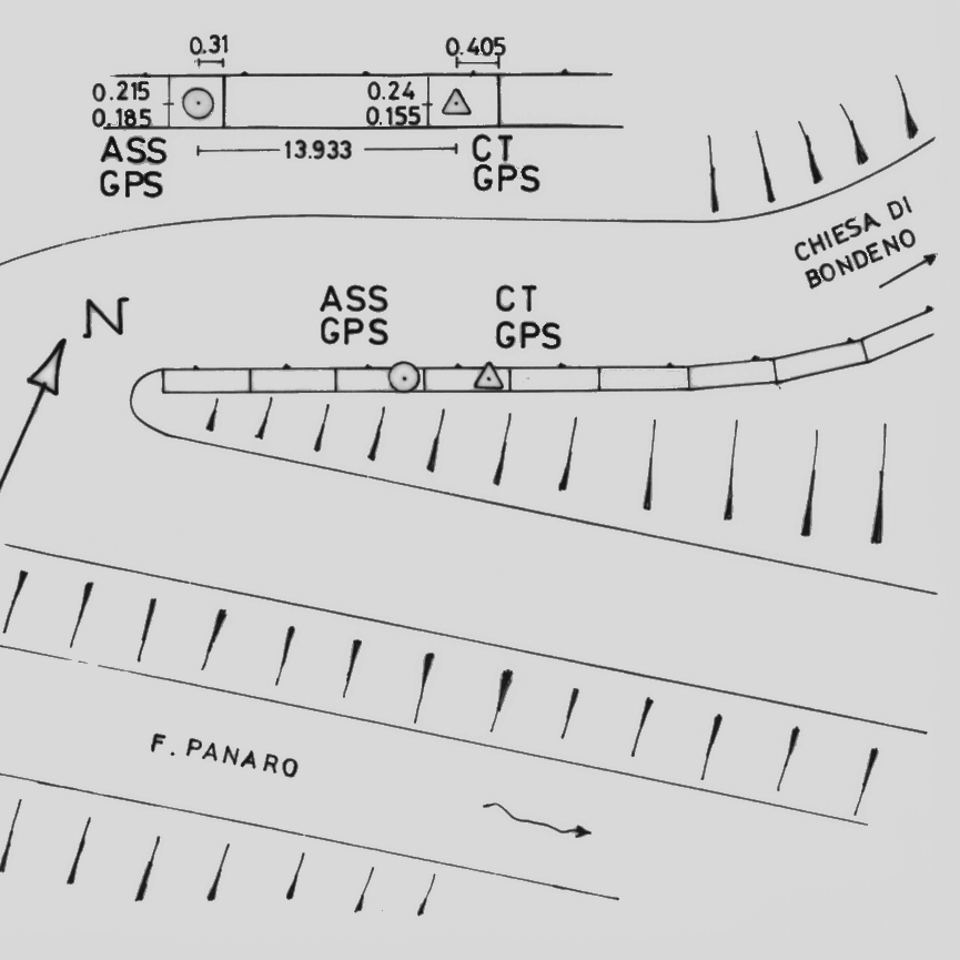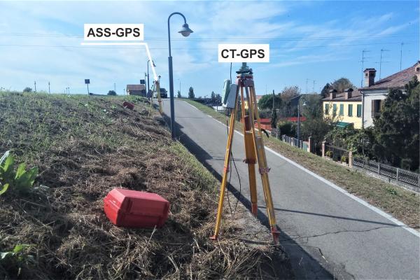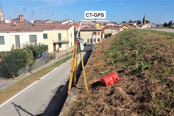 Centrino di tipo "GPS C" fissato sul muro in cemento armato di sostegno dell'argine del F. Panaro a sud della chiesa principale di Bondeno.