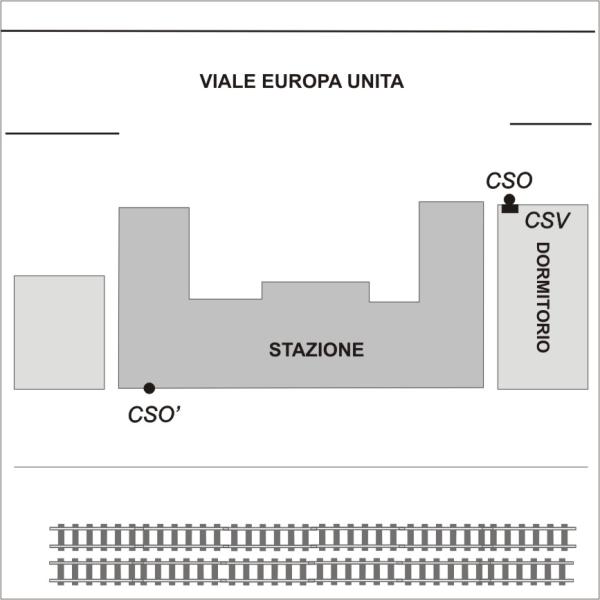[{"simbolo_contrassegno":"B1","materializzazione":"(CSO) – Lato strada, a sinistra dell'ingresso dei dormitori del personale viaggiante ."},{"simbolo_contrassegno":"B3","materializzazione":"(CSO' ) – A sinistra della soglia d'ingresso alla sala controllo, lato binari ."},{"simbolo_contrassegno":"V1","materializzazione":"(CSV) – In corrispondenza del cso ."}]