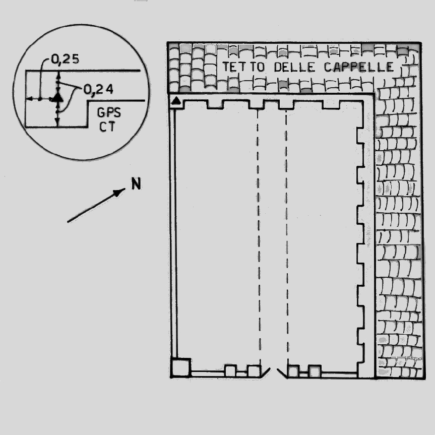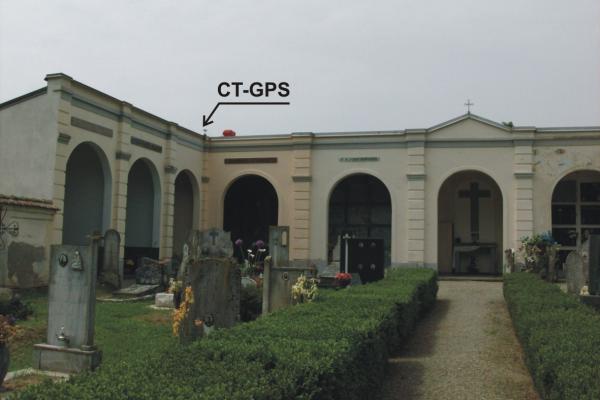 | materializzazione | Cimitero di Rizzolo. Sopra una colonna che sostiene il porticato delle cappelle, la più a sinistra del porticato di fondo per chi entra dal cancello. Centrino di tipo "GPS C" fissato in asse alla colonna. |