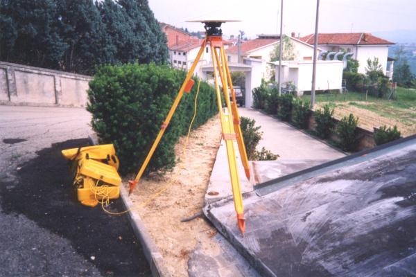 Centrino del tipo "GPS A" incollato su preesistente centrino metallico del Catasto (punto fiduciale GPS), posto alla sommità del muro di contenimento della rampa di accesso alla cappella.