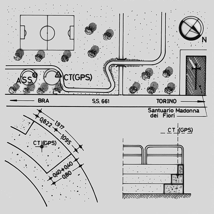 | materializzazione | Centrino del tipo "GPS C" fissato alla sommità del gradone intermedio, lato nord-ovest, della tribuna semicircolare in cemento armato più a nord delle due esistenti nel complesso sportivo comunale. |