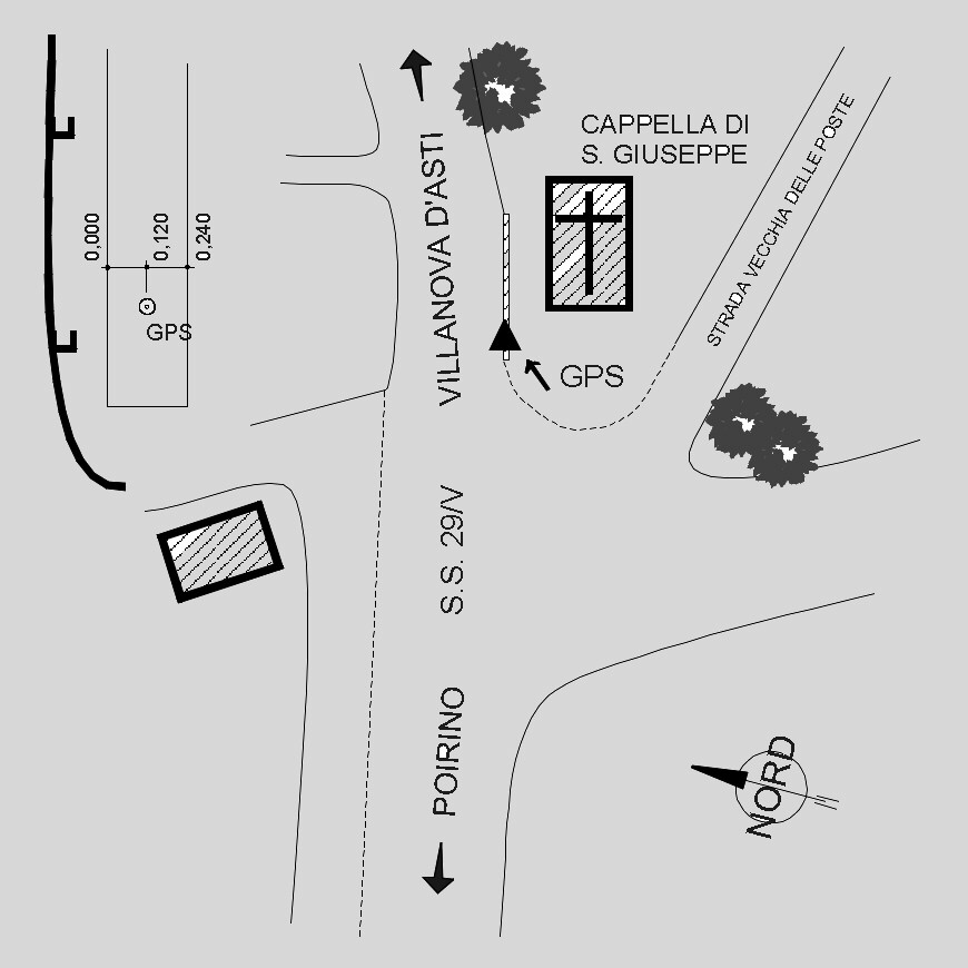 | materializzazione | Centrino del tipo "GPS C" fissato sul cordolo in cemento vicino all'ingresso della cappella. |