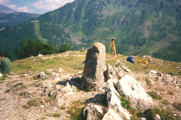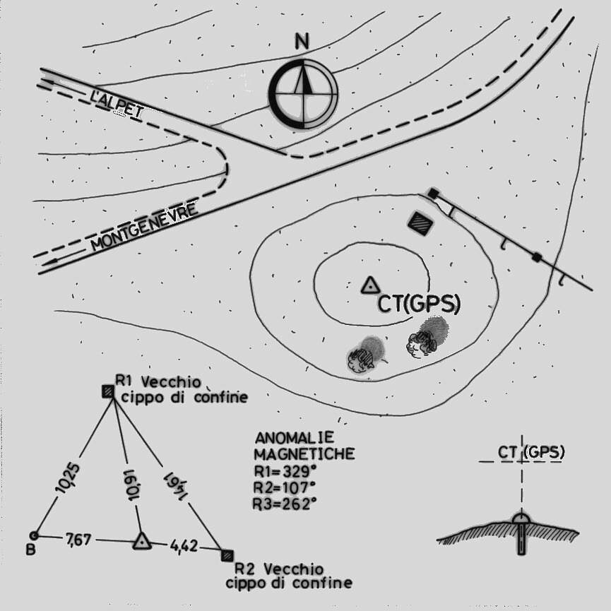 | materializzazione | Centrino in ottone a testa semisferica del diametro di 18 mm fissato su roccia affiorante situata alla sommità del monte omonimo. Riferimenti: R1, R2 (vecchi cippi di confine); B (centrino in ottone). |