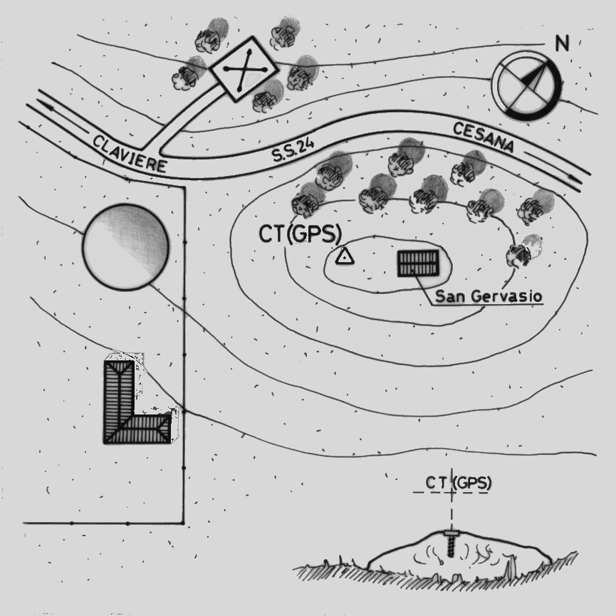 | materializzazione | Centrino del tipo "GPS C" fissato su roccia affiorante sita a sud-ovest della chiesetta di San Gervasio edificata alla sommità di una collinetta ubicata a nord – est del centro abitato. |