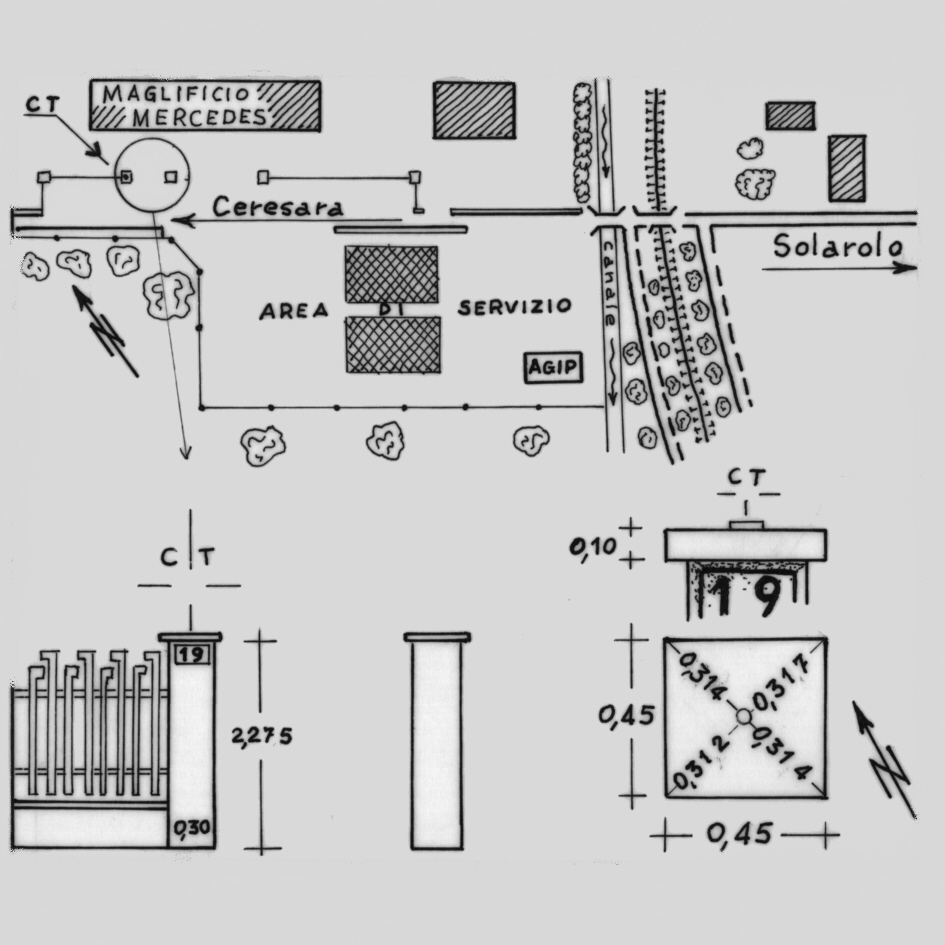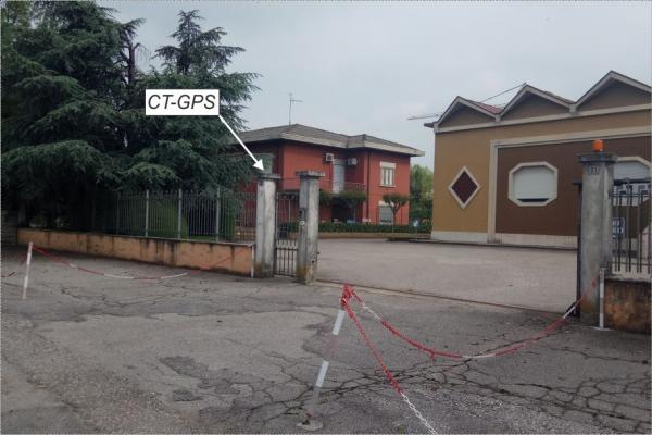 Centrino di tipo "GPS A" fissato mediante collante sulla colonna sinistra (guardando il cancello) che regge il cancello pedonale del Maglificio Mercedes, situato a Ceresara, di fronte ad un distributore AGIP.