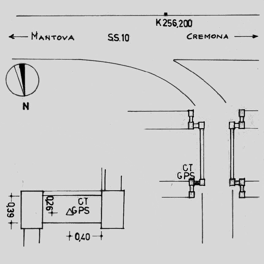 Centrino di tipo "GPS C" infisso alla sommità della sporgenza della spalla nord-est del ponte sul canale parallelo alla S.S.10 e ubicato nei pressi della casa cantoniera al km 256,262.