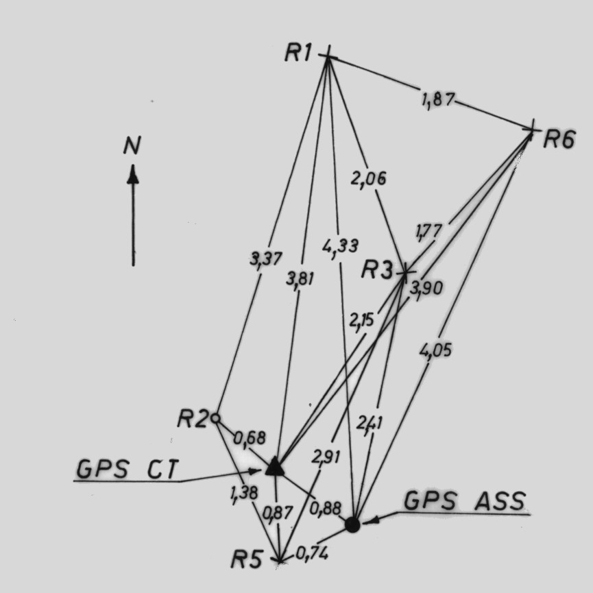 Centrino del tipo "GPS C" cementato alla sommità del monte omonimo. Riferimenti R1, R3, R5, R6 (croci incise su roccia), R2 (centrino in ceramica forata).