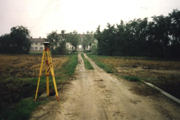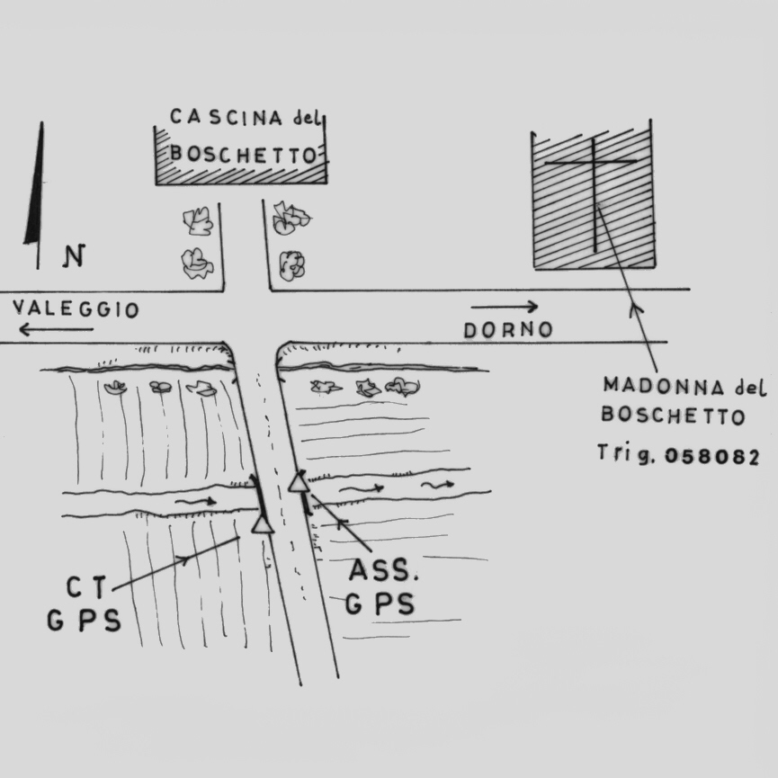 Centrino di tipo "GPS A" fissato sul centrino di superficie costituente il trigonometrico 058582 sul ponticello della strada di campagna, situato di fronte alla cascina del Boschetto.