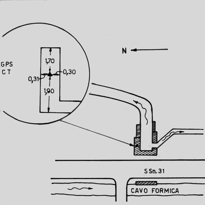 | materializzazione | Centrino di tipo "GPS C" fissato sul lato nord della chiusa esistente su un canale al bordo est della S.S.31 all'altezza del km 9,650 circa, quasi davanti ad un ponticello sul grosso canale (Canale Formica) che costeggia il lato ovest della statale. |