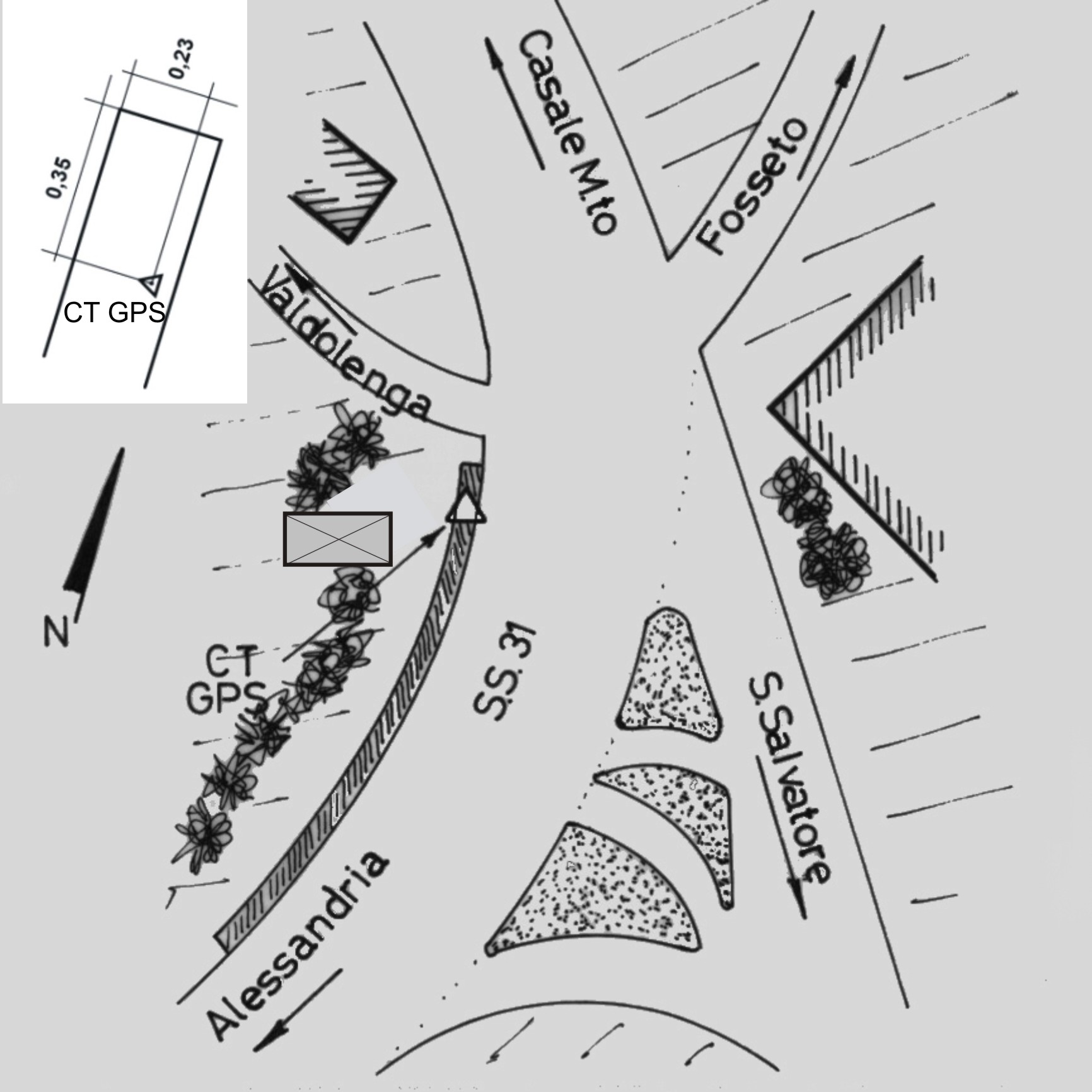 | materializzazione | Centrino IGM del tipo di superficie cementato sulla parte finale di un cordolo in calcestruzzo esistente sul lato ovest della S.S. 31 al Km. 41 circa di fronte alla Cascina Nuova. |
