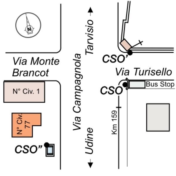[{"simbolo_contrassegno":"B1","materializzazione":"(CSO) – Bullone Infisso nella spalletta del ponticello situato all'imbocco di via Turisello, di fronte al tabernacolo."},{"simbolo_contrassegno":"P3","materializzazione":"CSO') – Chiusino di III cat. interrato lungo il muro di via Turisello, sul fianco destro del tabernacolo. Rimisurato con quota del CSO del 2003."},{"simbolo_contrassegno":"V1","materializzazione":"(CSV) – Mensola infissa in prossimit\u00e0 dello spigolo sinistro della facciata dell'edificio rurale al N\u00b0 CIv. 1 di via Monte Brancot."},{"simbolo_contrassegno":"B4","materializzazione":"(CSO'') – Centrino universale Inox infisso sul cordolo perimetrale del tombino in cemento armato esistente nel terreno annesso all'abitazione al N\u00b0 Civ. 77, in prossimit\u00e0 delle sede della S.S. 13. Misurato dal CSO con quota del 2003."}]