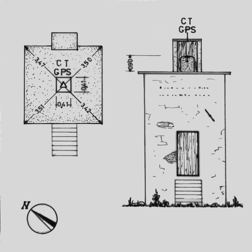| materializzazione | Centrino del tipo "GPS A" incassato in centrino IGM del tipo di superficie cementato alla sommità di un basso pilastrino in cemento e muratura eretto sulla soletta di copertura della torretta detta "Casino Teodoro". |