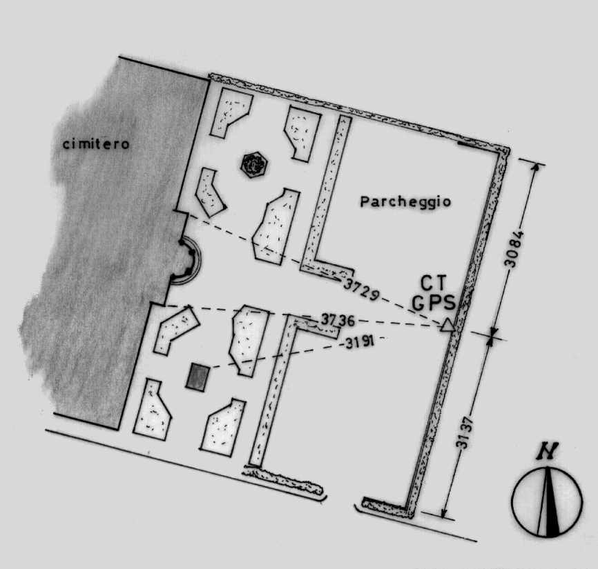 | materializzazione | Centrino del tipo "GPS A" fissato su preesistente centrino IGM del tipo di superficie cementato nella pavimentazione del parcheggio antistante il cimitero. |