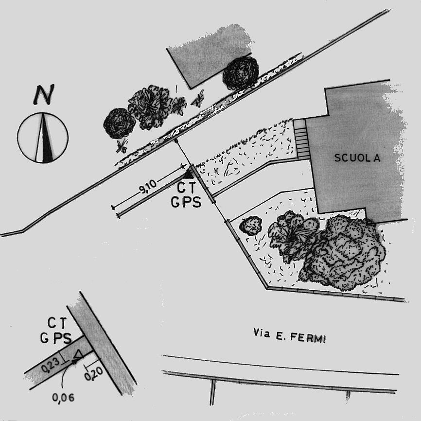 | materializzazione | Centrino del tipo "GPS C" infisso alla sommità di un muretto in cemento, su cui è ancorato un parapetto metallico che divide il parcheggio antistante la Scuola Materna Statale "E. Fermi" da un accesso privato. |