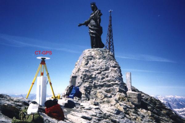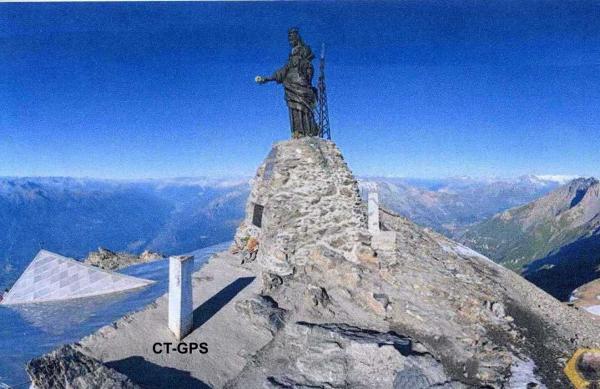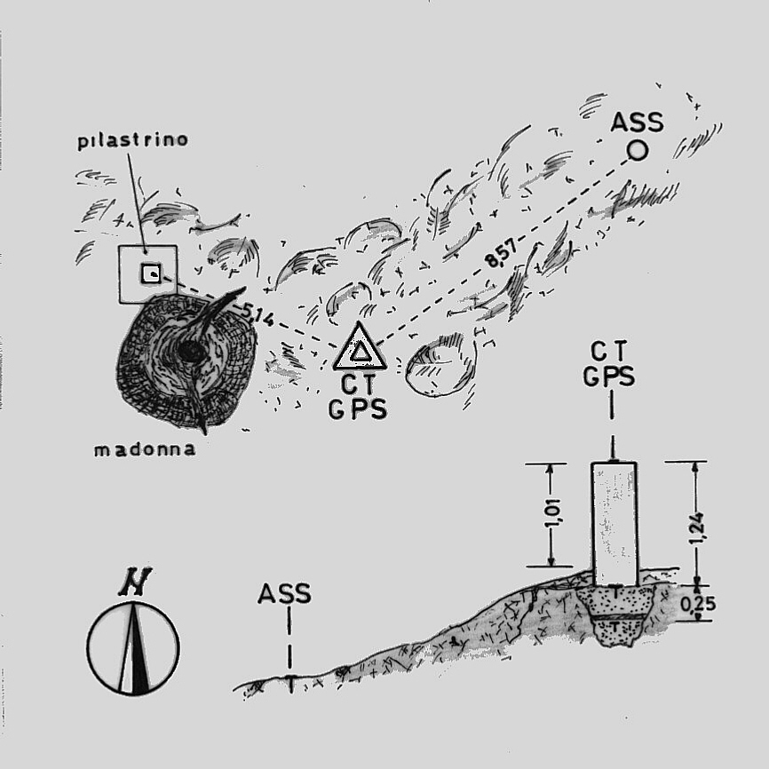 Centrino del tipo "GPS A" fissato alla sommità di un pilastrino metallico a sezione triangolare con sottostanti centrini IGM del tipo di superficie e di fondo coassiali.