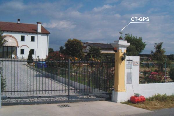 | materializzazione | Centrino inox del tipo "GPS C" infissato sulla sommità di un pilastro di destra del cancello di ingresso della casa al n°17A di via Risaie. |