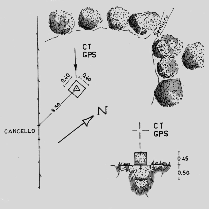 | materializzazione | Centrino di tipo "GPS C" fissato sul pilastrino in mattoni in asse a sottostanti centrini di superficie e di profondita. |