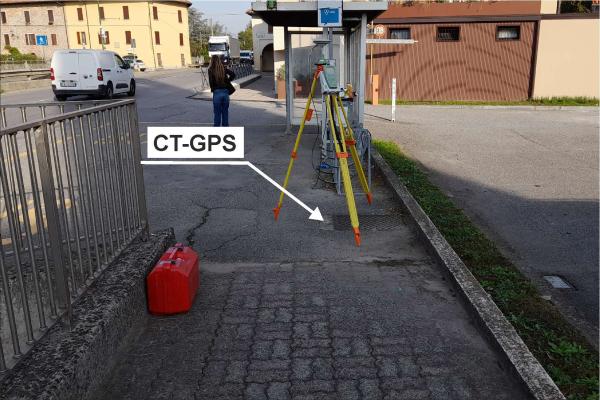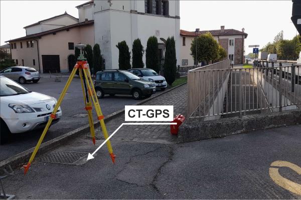Centrino del tipo "GPS C" fissato sulla soletta in cemento del tombino, situato nell'aiuola a margine del marciapiede.