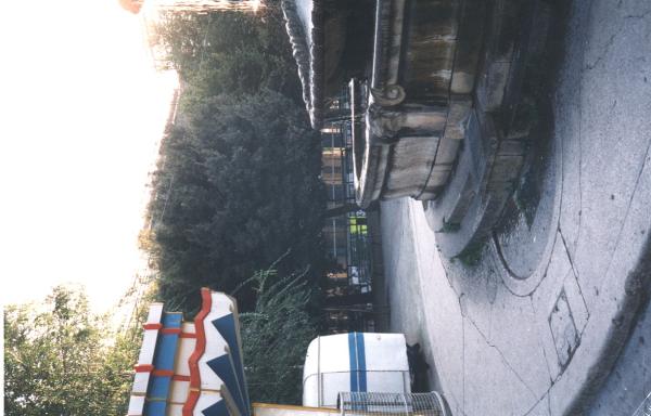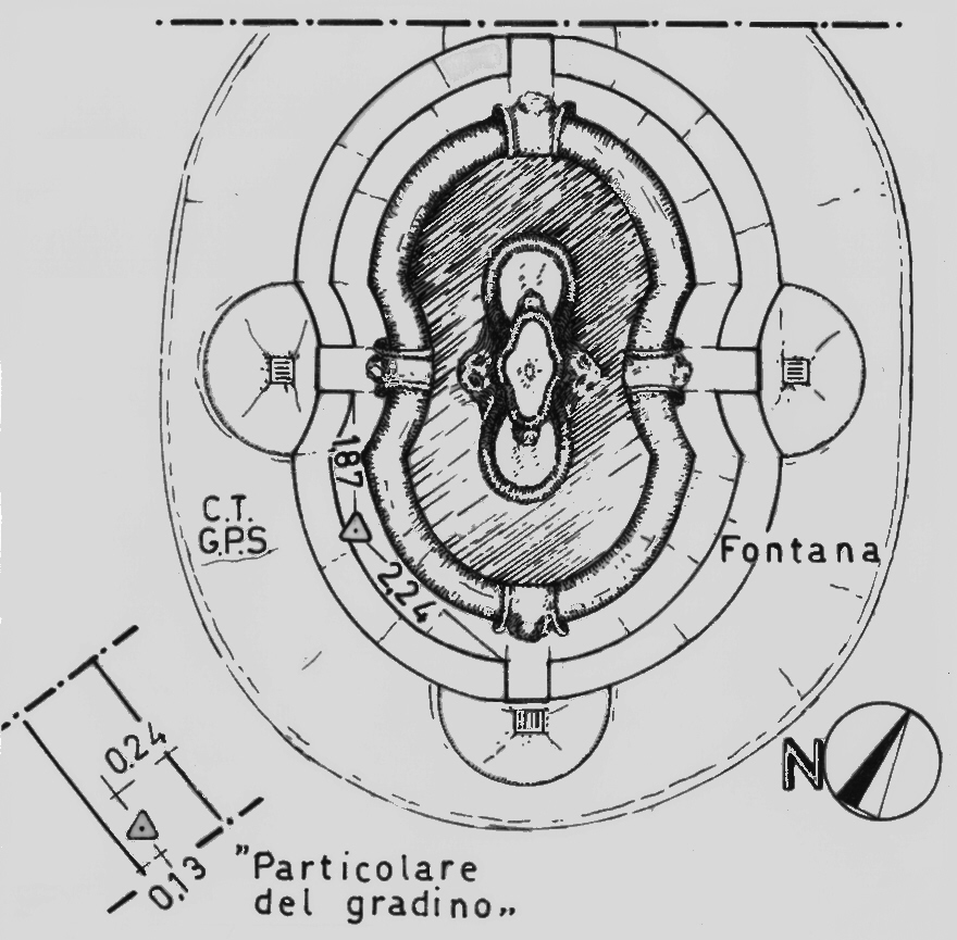 Centrino di tipo "GPS C" fissato sul secondo gradino in pietra del basamento alla fontana in Piazza Giuseppe Zanardelli.