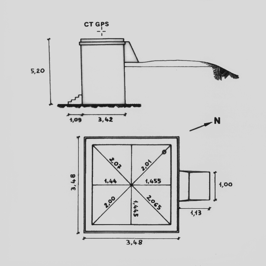 | materializzazione | Centrino di tipo "GPS C" fissato al centro della soletta di copertura di un serbatoio dell'acquedotto situato alla sommità di una collinetta a nord del nucleo abitato di S. Maria d'Irsi. |